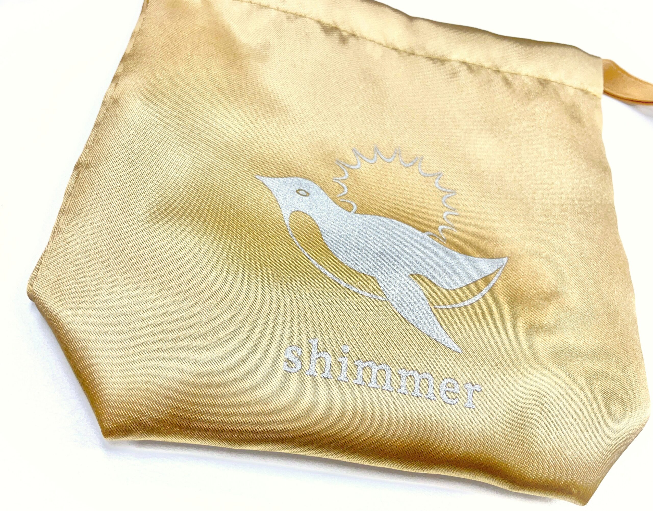 お店移転のノベルティ用の製作頂きました。 ポリエステルサテンの生地に シルバーのプリントを施しています。